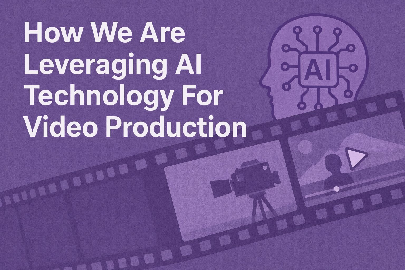 Prompt: I would like an image with the same theme and the same colors as this (referring to previous article image I uploaded), it is going to be the image for the next article in the series. The image is for an article titled “How We Are Leveraging AI Technology For Video Production” I would like to see a stylized film strip and something that looks like frames from a video